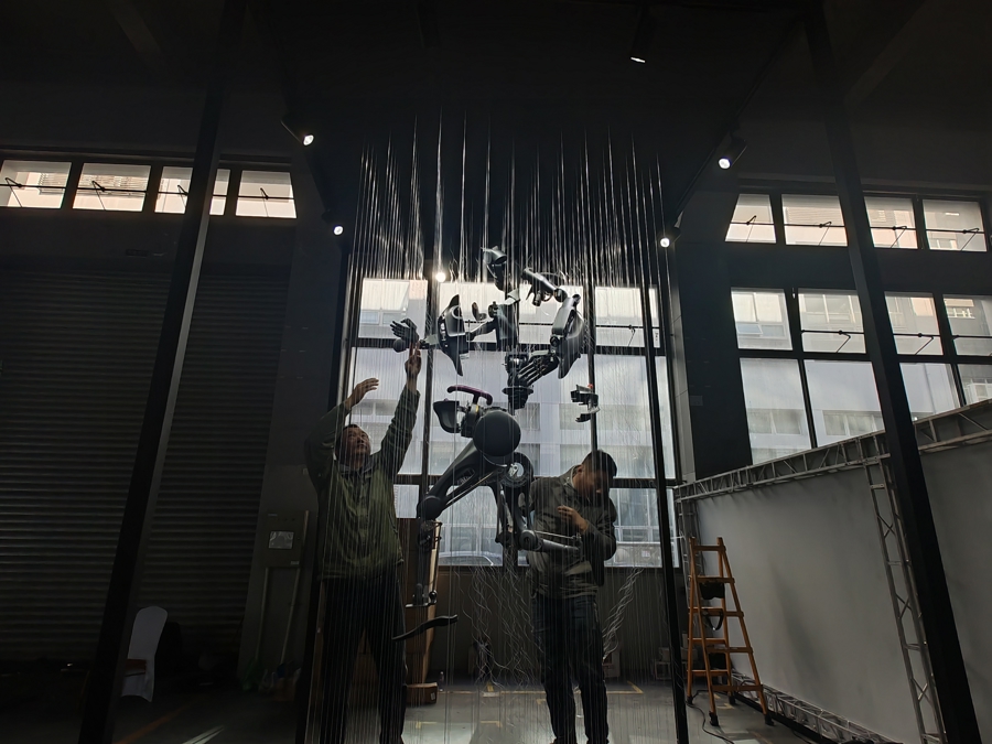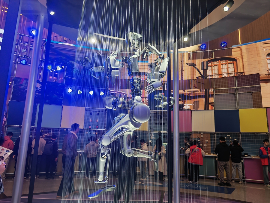 答案藏在张江机器人谷内。这里,一台人形机器人被拆解成数十个结构件,由大量垂直线束连接。